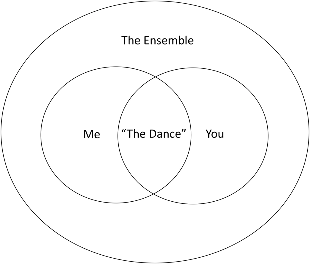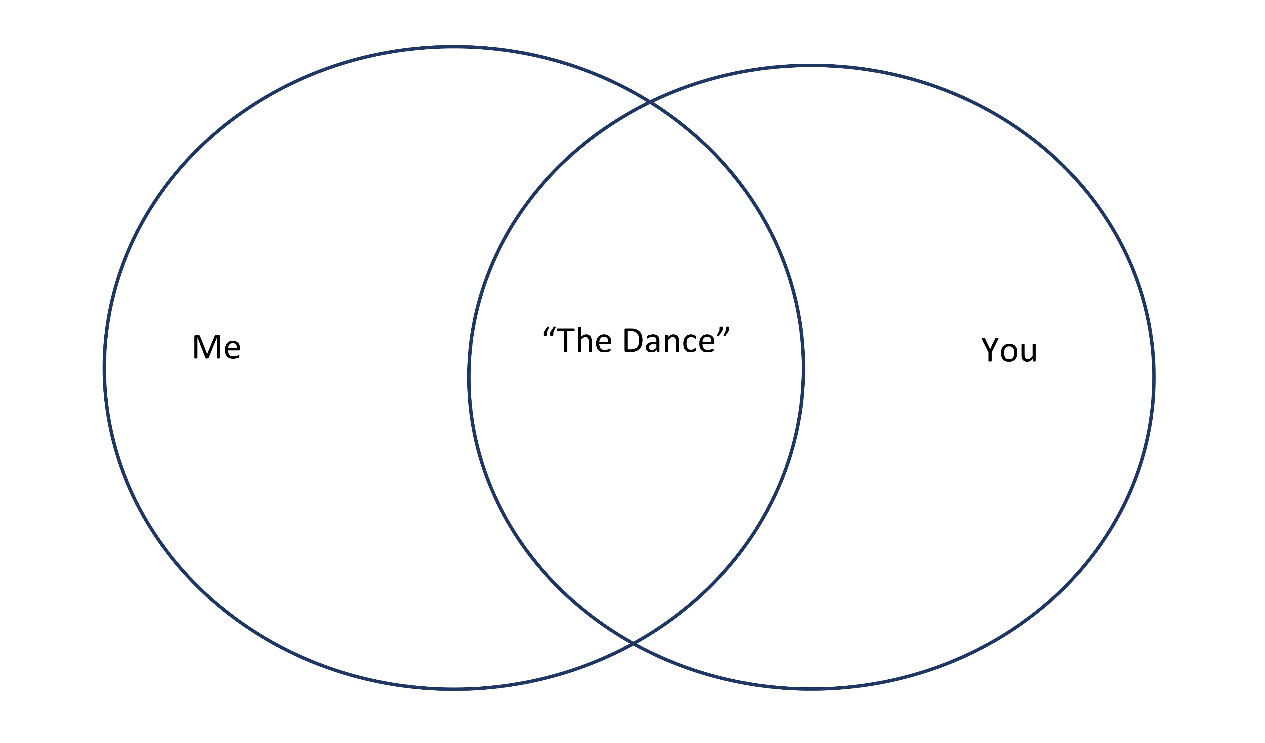 When I dance with another person, there is a feeling that our energies coalesce to create a third entity. I call this third entity The Dance. For me, The Dance is a liminal space created by dance partners co-following what is emerging between them. It is not me and is not you but instead it feels like its own thing. The Dance might want slow and introspective. It might want to be playful. It might want lots of space. I can say yes or no to The Dance. I can guide it somewhat, but I don’t get to choose The Dance because The Dance chooses itself. This act of service to The Dance can take me on a journey that may bore me, move me, amaze me, cause me to weep, be wild and energetic or take me into great moments of beauty, power, or fragility. I give up my freedom so that I can be contained in the service of co-creating.